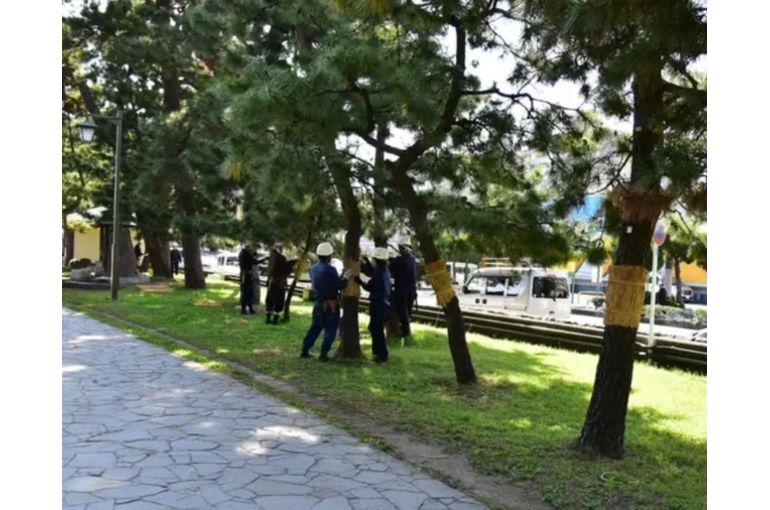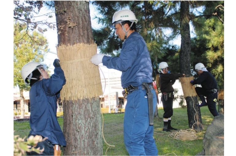 Komomaki is a traditional pest control method in which straw mats are wrapped around pine trees before the cold weather sets in to attract pine bark beetles and pine weevils, which are natural enemies of pine trees, and then the mats are removed and burned before the weather warms up.