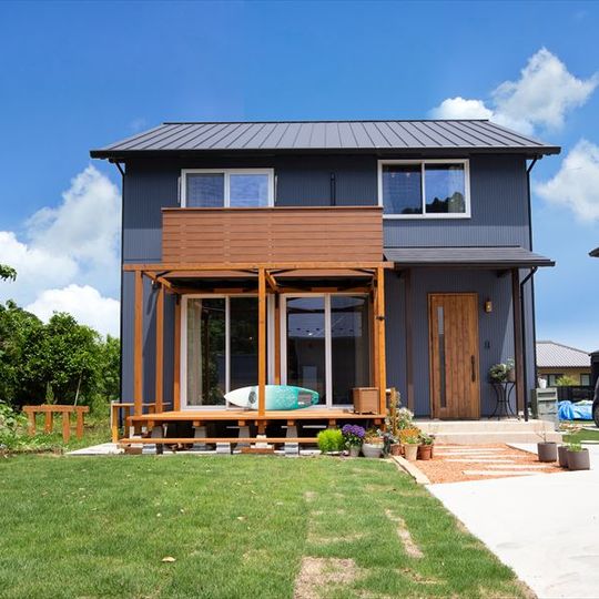 趣味の自転車やサーフィンの道具も収まる広々土間収納 リビングから広がるウッドデッキは開放感抜群 広いリビングに、家族でくつろげる小上がりの畳がある家です。 -