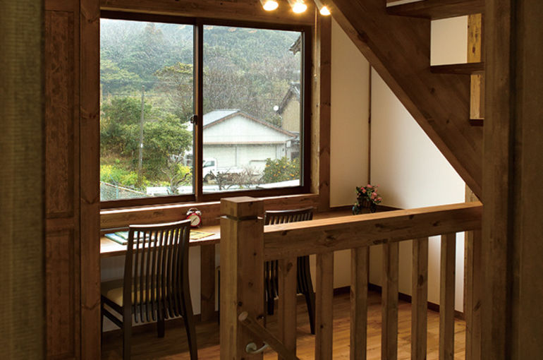 2階のフリースペースに設けた造作のテーブルは、お茶を飲みながら四季折々の景色を楽しんだり、作業スペースとしても活用可能なスペース。