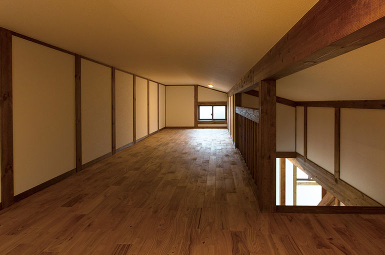 固定階段で上る小屋裏収納は、重いものや、大きな荷物も楽に上げ下ろしができ、子どもの遊び場として場としても、男の隠れ家としても利用できる魅力のスペース。