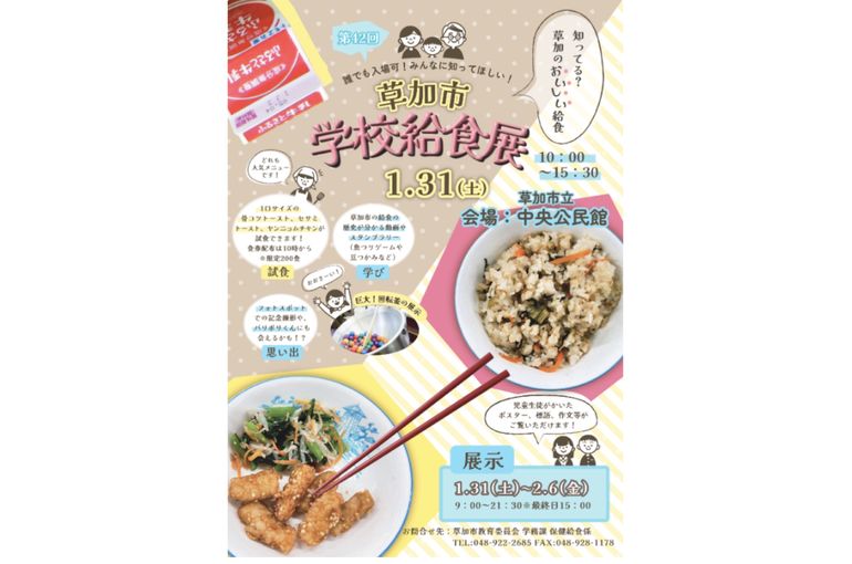 草加市では、子どもたちが毎日学校で食べる給食を、見て、知って、味わることで、学校給食の魅力や、給食にどんな工夫がされているのかを楽しく学ぼうと学校給食展を開催します。