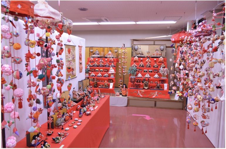会場では、3月3日の桃の節句にちなみ、「七段雛飾り」や各種内裏雛、関東圏ではなかなか見かけない「御殿飾り」や市民の方々が制作された大小様々なサイズの吊るし飾りを展示してあります。